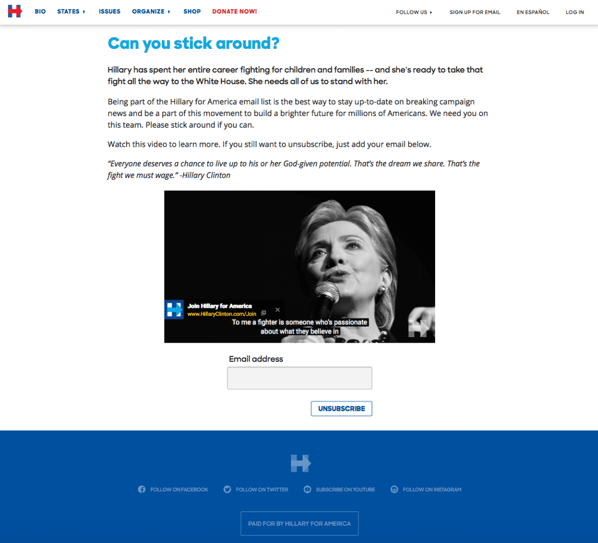 Take for example this bullet email from Clinton. It lists five ways, all uniquely crafted, to increase either commitment to the brand of Hilary, or to spread the message via referral.